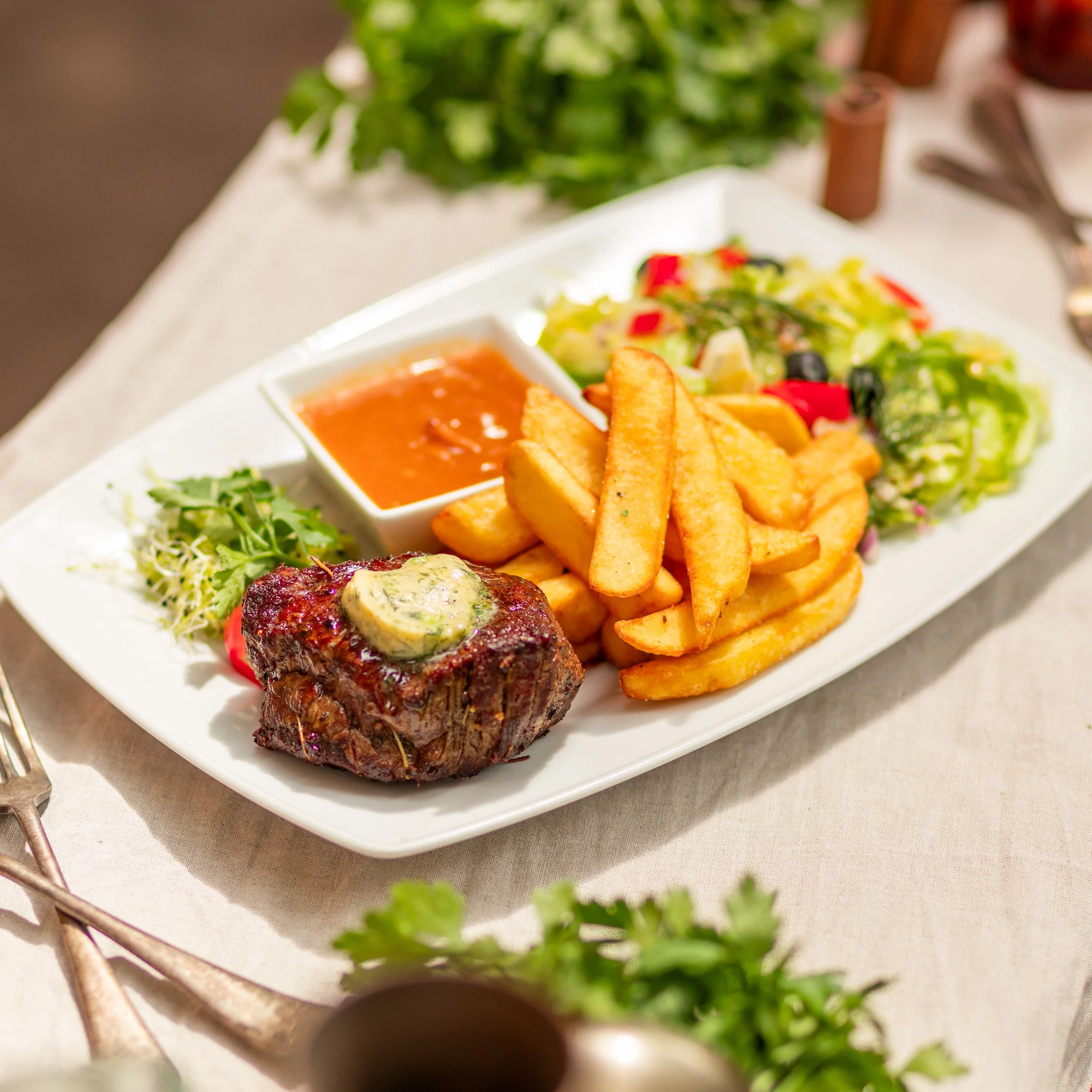 Rindersteak in Pfeffersauce mit Pommes frites und gemischtem Salat