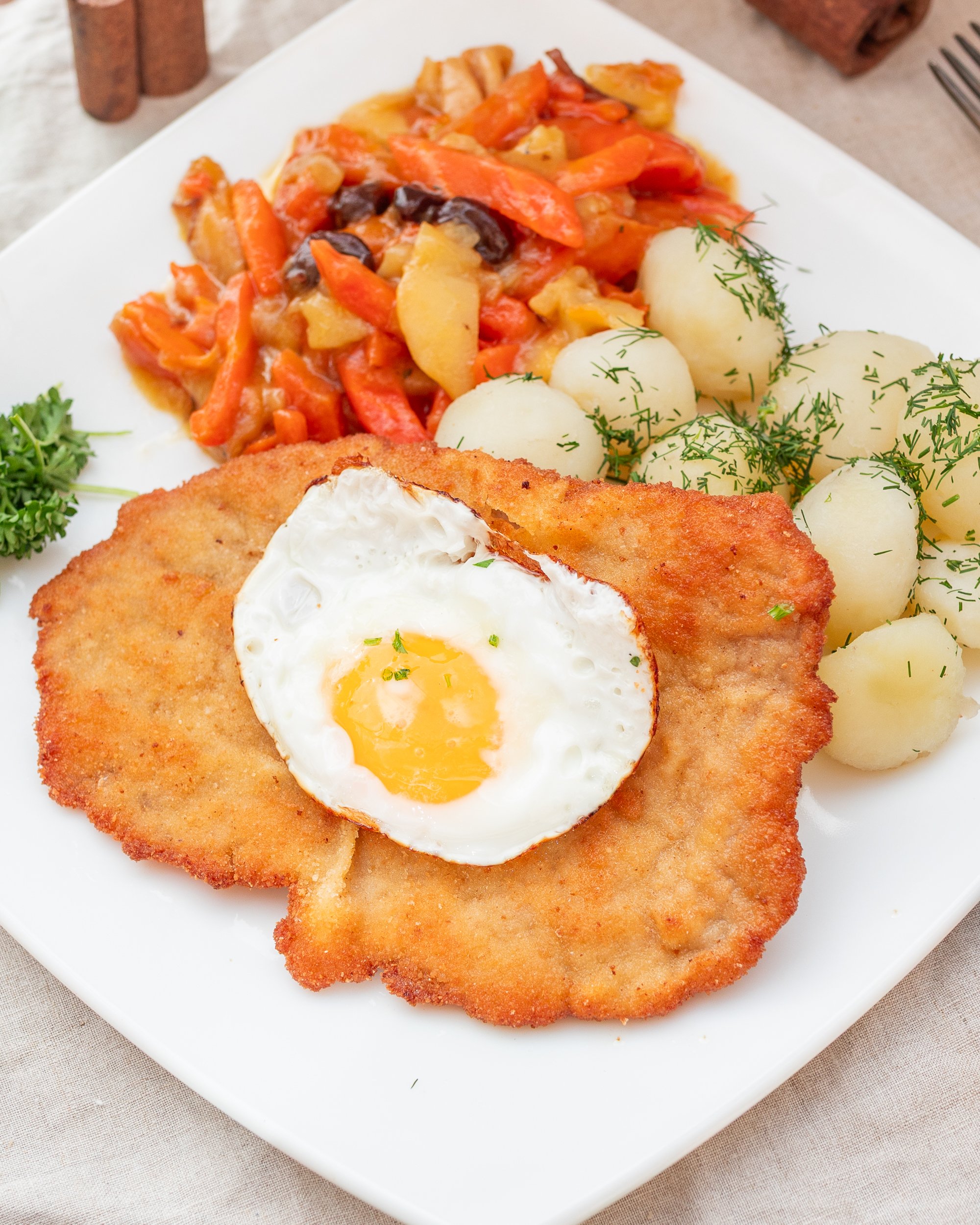 Veal Schnitzel topped with a fried egg and potatoes with tzimmes