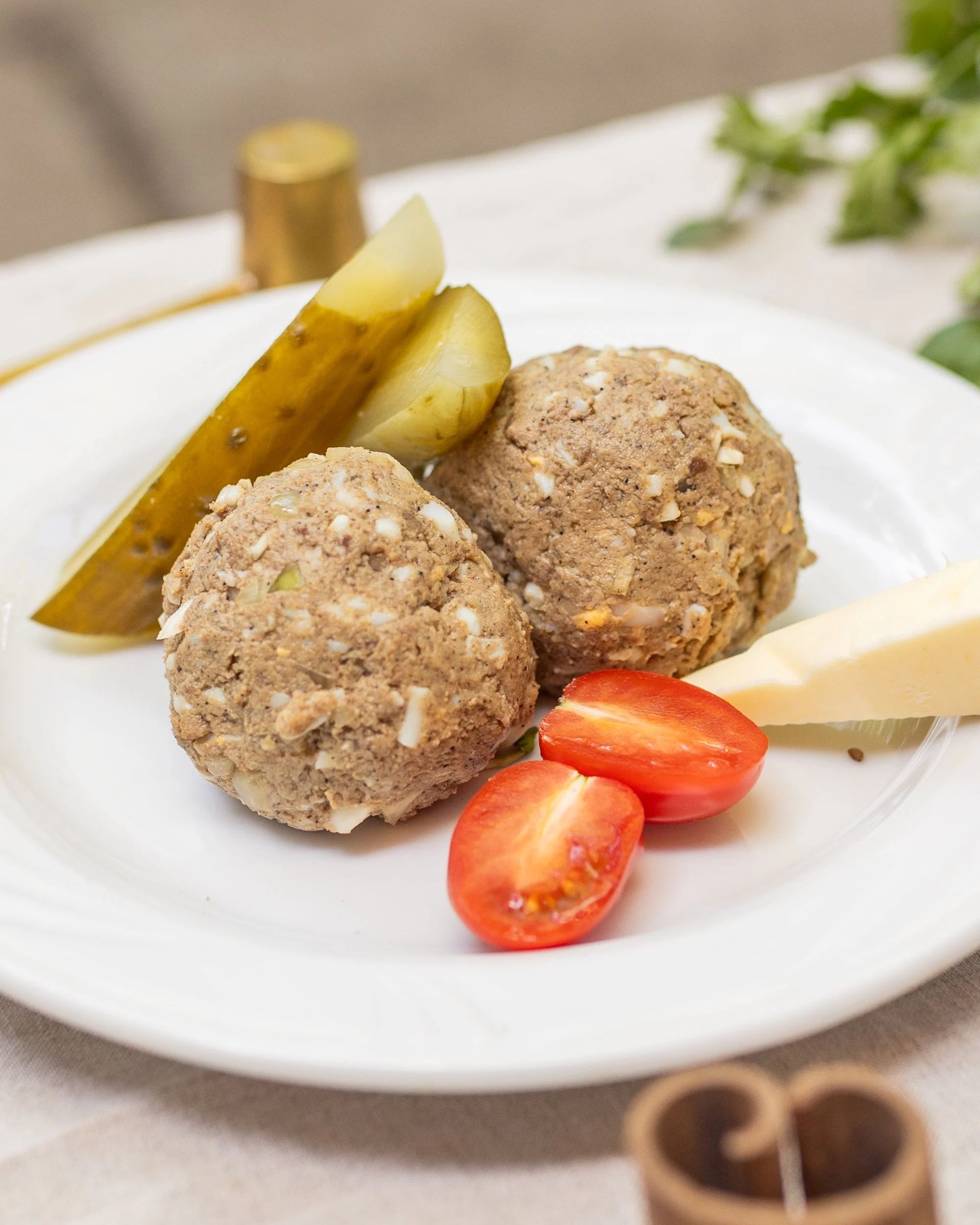Our version is a harmonious blend of carp with a hint of sweetness from raisins and almonds, served in a subtle, clear jelly. Preparing authentic Gefilte Fish requires master-level precision—the key is the perfect balance of black pepper and onions to offset the sweet notes. It is a true culinary rarity that has connected generations around the dinner table for centuries