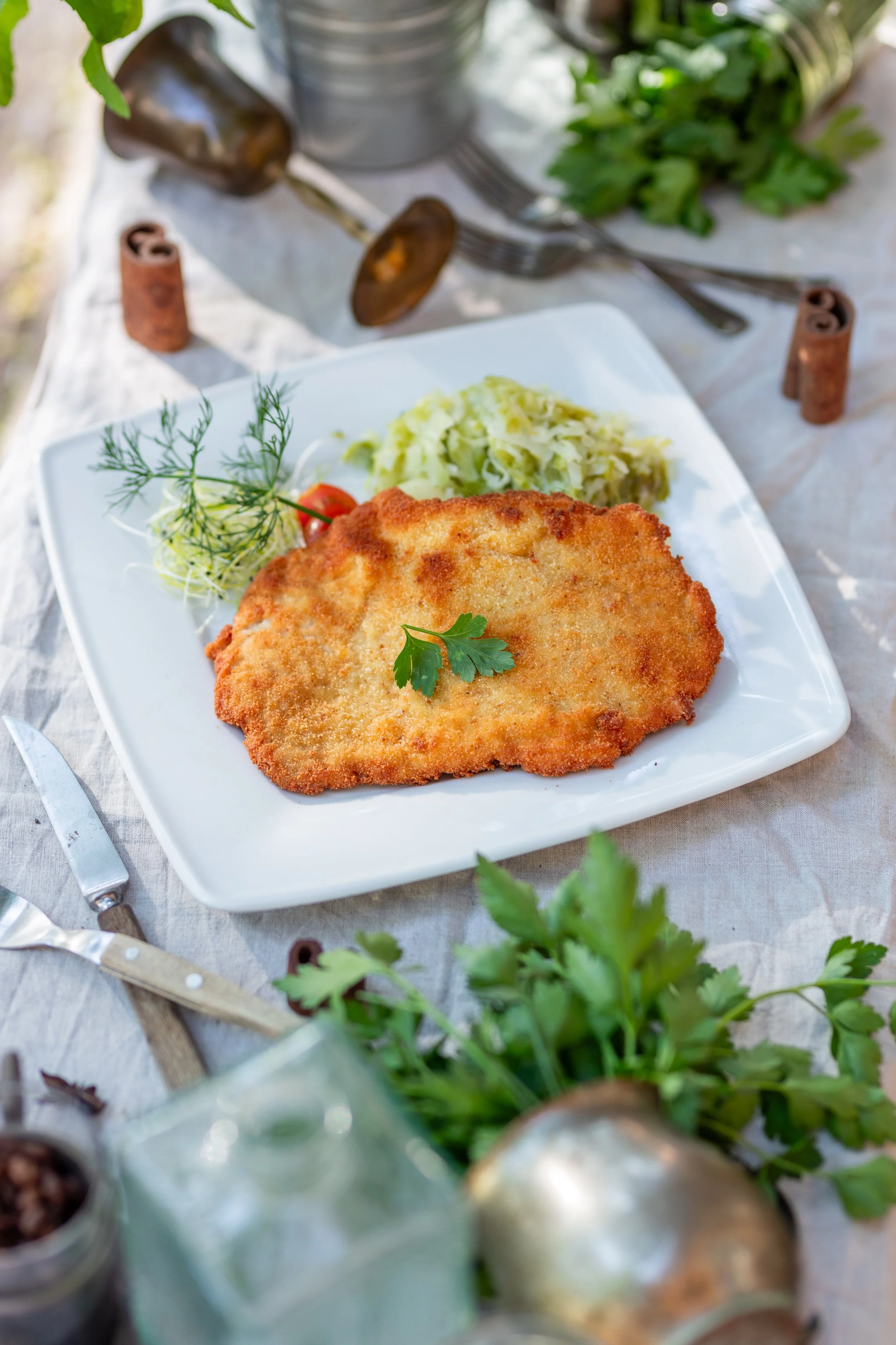 Main Course: Classic pork schnitzel served with mashed potatoes and braised cabbage – the perfect comfort meal.