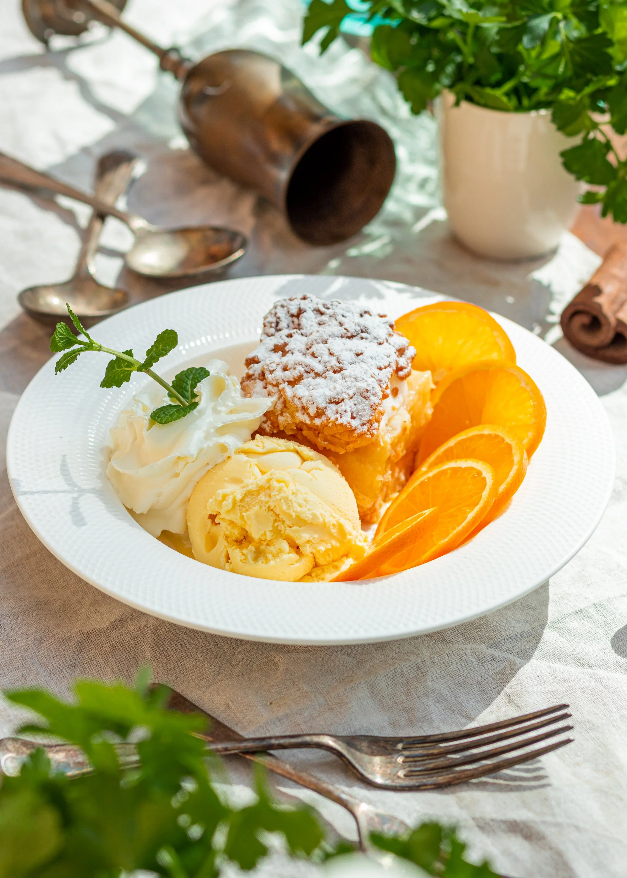 No summer dinner is complete without a dessert, and at Pod Samsonem we have plenty to tempt you. The warm apple pie, served with a scoop of vanilla ice cream and topped with a generous blanket of whipped cream, is a classic that delights in any season but tastes especially magical when enjoyed in the open air. For something lighter and cooler, our ice cream sundae offers a simple yet refreshing finish to your meal, letting you linger on the terrace as the city lights begin to glow.
